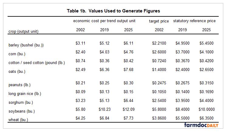 Cost per trend output unit takes both cost per acre and yield into account. USDA, ERS (Economic Research Service) computes an economic cost of production per acre. It is divided by an estimate of US trend yield obtained from a linear time trend regression over the 1974-2024 crop years. Table 1a in the Data Note at the end of this article contains the economic cost per acre and trend yield estimate for barley, corn, cotton / seed cotton, oats, peanuts, long grain rice, sorghum, soybeans, and wheat for 2002, 2019, and 2025. These are the initial crop year under, respectively, the 2002, 2018, and 2025 Farm Bill. Table 1b contains the target prices for 2002, statutory reference prices for 2019 and 2025, and economic cost per trend output unit for these years. Congress replaced upland cotton with seed cotton in the 2018 and 2025 Farm Bills. California grows mostly Temperate Japonica rice, but rest of the US grows mostly long grain rice. Their reference prices have differed since the 2014 Farm Bill. Cost of rice in this article is US cost excluding California while support prices and trend yields are for US long grain rice. Rice is referred to as “long grain rice” hereafter in the main body of this article.