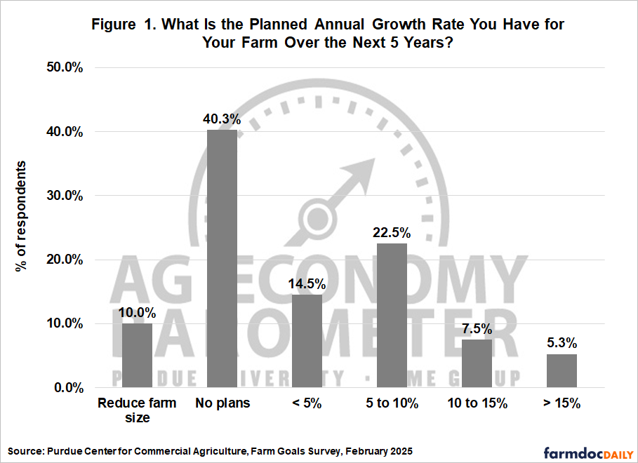 A recent survey of 400 U.S. producers was conducted in late February 2025 to assess individual farm goals, producer sentiment, farm growth, succession plans, sustainability and risk preferences, resilience, and adoption of conservation practices. A previous article focused on farm goals and their tradeoffs (Langemeier, 2025). This article focuses on the relationship between farm growth, farm goals, producer sentiment, and farm characteristics.