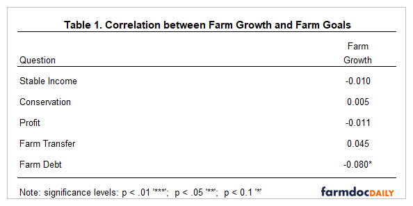 This article presents results from a recent survey pertaining to farm goals, and discusses the relationships between farm growth, farm goals, producer sentiment, and farm characteristics. Consistent with previous surveys, only about 50% of the sample of farms are expected to grow in the next 5 years. Of the remaining 50%, 40% expect to remain the same size and 10% expect to reduce the size of their farm. Farms that had a goal to reduce debt over time expected to grow at a slower pace than other farms. Farm growth was positively related to producer sentiment, adding a family member to the operation, a strong balance sheet, and the adoption of new practices, and negatively related to operator age. Moreover, a willingness to take on risk was positively associated with farm growth.
