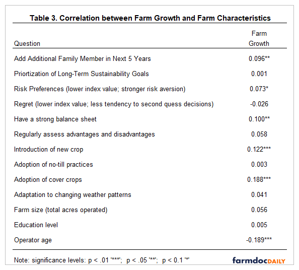 Correlations between farm growth and selected farm characteristics are displayed in Table 3. Significant and positive correlations were found between farm growth and the following variables: adding an additional family member in the next 5 years, risk aversion, having a strong balance sheet, the introduction of a new crop, and the adoption of cover crops. A significant and negative correlation was found between farm growth and operator age. In general, we would expect farms that are planning on adding at least one additional member to have more aggressive plans with regard to farm growth. The correlation coefficient between farm growth and risk preferences suggests that farms that are interested in growing are less risk averse. Farms with a strong balance sheet are in a more solid position for expansion. Farms with more aggressive expansion plans and younger operators are more likely to adopt new practices or technologies such as the introduction of a new crop or cover crops.