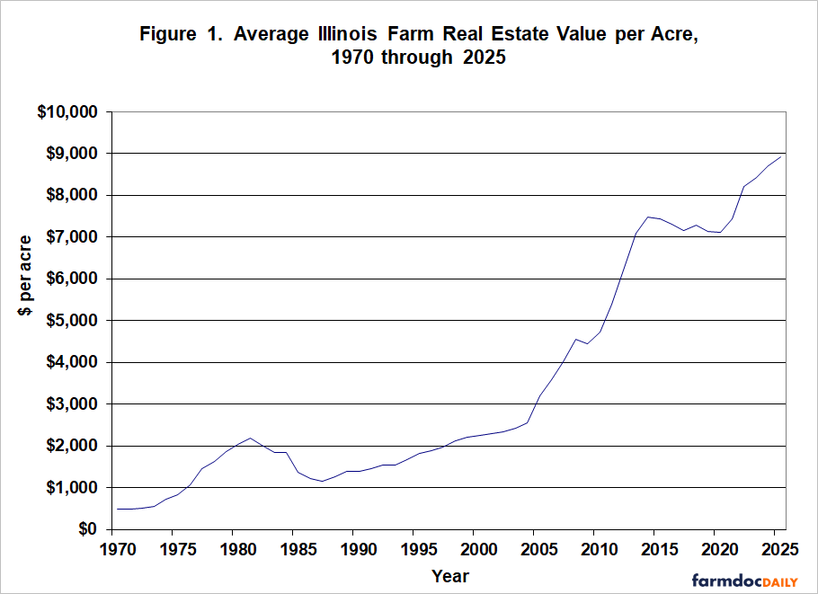 The average Illinois farm real estate values from 1970 through 2025 are listed in Table 1 and graphically in Figure 1.  The average farm real estate value for Illinois in 2025 was $8,930 per acre.  This includes the value of all land and buildings used for agricultural production.  The figure was 2.6 percent higher than the adjusted 2024 average of $8,700 per acre.  This is the fifth year in a row of at least a 2.4 percent increase since 2020.  With a 2.6 percent increase in the average farm real estate value from 2024 to 2025, the average Illinois farm real estate value for 2025 was 22 percent higher than the 2016 value of $7,300 per acre ten years ago.