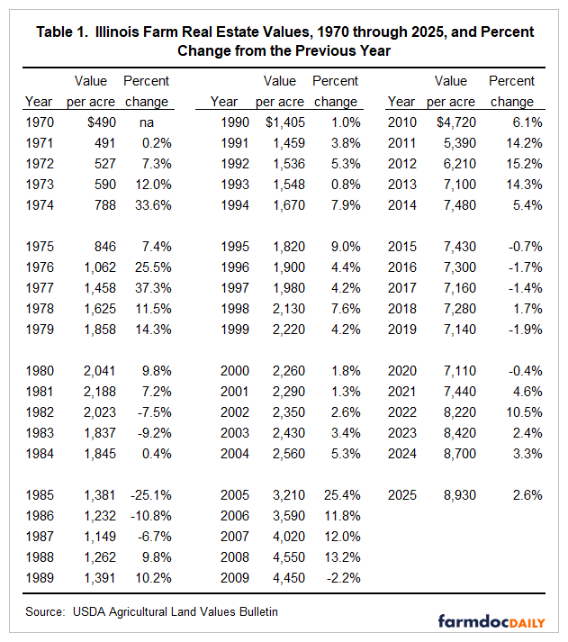 Table 1. Illinois Farm Real Estate Values, 1970 through 2025, and Percent