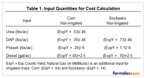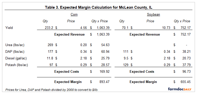 As an example, we show the expected margin calculation for non-irrigated corn and soybean for McLean county. Urea, DAP and Potash prices are divided by 2,000 to convert from tons to lbs.