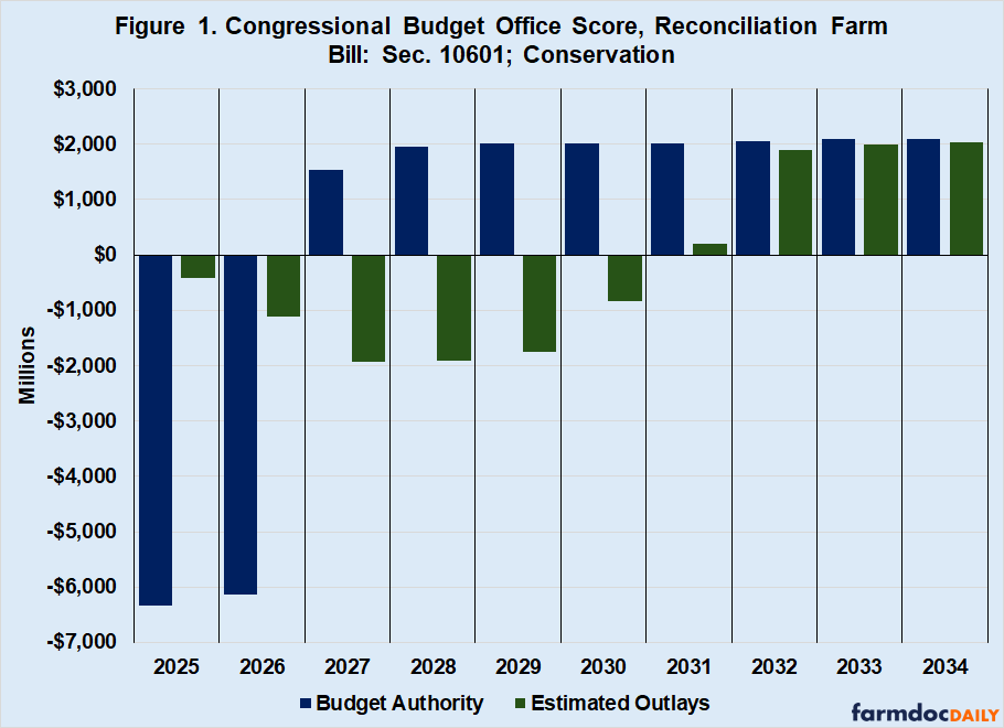 The Congressional Budget Office (CBO) scored the Reconciliation Farm Bill’s changes to conservation policy as saving $1.8 billion over the ten years of the score (CBO, July 21, 2025). This is a bit of mathematical illusion due to the method of CBO scoring for conservation and the difference between budget authority (BA)—the amount Congress authorized—and outlays, the projected amount of that BA that CBO thinks will be spent based on historic spending rates. The January 2025 CBO baseline for these four (EQIP, CSP, ACEP, RCPP) conservation programs was $37.75 billion in BA (FY2026-2035) but slightly less, $37.257 billion, in outlays for those ten fiscal years (CBO, January 2025). The January baseline also projected $15.7 billion in remaining outlays (FY2026 to 2031) of the $18 billion appropriated by the Inflation Reduction Act of 2022 (IRA). Rescinding the IRA appropriation produced a reduction in outlays, which was used to increase the budget authority. Figure 1 illustrates the CBO score for the conservation provisions (Sec. 10601) of the Reconciliation Farm Bill. Note that the CBO score was for the ten fiscal years 2025 to 2034.