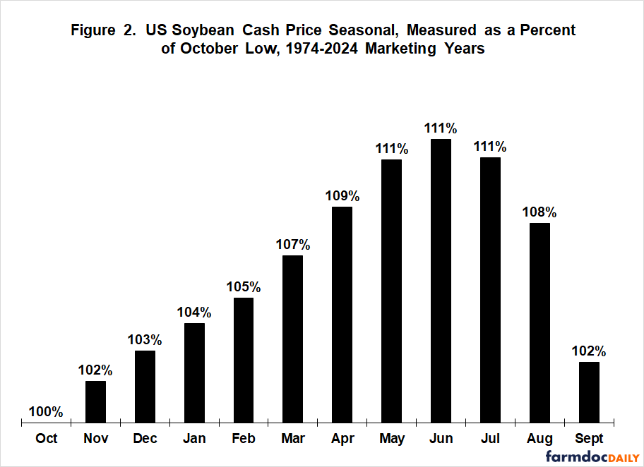 Although US cash corn price since 1973 has averaged nearly the same in October ($2.992) and November ($2.993), October is used as the harvest low price month. The decision in part reflects that October is the harvest low for soybeans (see next section). Average US cash corn price increased through June, peaking at 113% of its October price (see Figure 1). Price increased the most (3 percentage points) from November to December and from December to January. It declined on average after June. Largest decline was from August to September. US cash price was higher in roughly one-third of the years after June, specifically, 39%, 32%, and 32% of the years for July, August, and September, respectively. For a brief discussion of data sources and procedures, see Data Note 1.