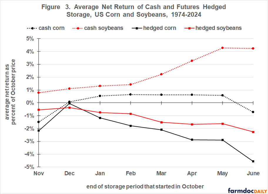 This article extends the October 2, 2025 farmdoc daily on corn and soybean storage cost by evaluating net returns to storing US corn and soybeans since 1973. Cash storage after June is generally not profitable as corn and soybean prices decline on average and in a majority of years. Net return to cash and futures hedged storage ending no later than June does not differ statistically from $0, implying returns just cover total storage cost. This finding nevertheless is consistent with building on-farm storage because on-farm storage provides other opportunities to improve farm profits, such as faster harvest, thus less harvest loss, and more flexible post-harvest marketing, such as location of cash sales. Although not statistically different, cash storage return has been notably higher for soybeans than corn, which is consistent with consumption growing faster for soybeans. Hedged storage offers the advantage of lower net return risk, especially for longer storage periods.