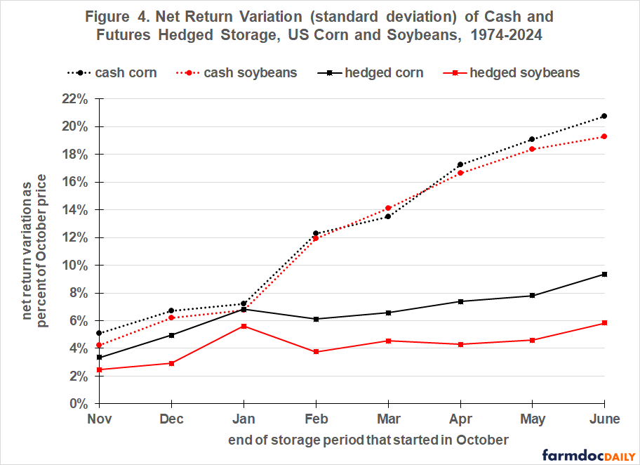 Average net return to futures hedged storage never exceeds $0 for both corn and soybeans (see Figure 4). Moreover, net return is statistically less than $0 with 99% confidence for hedged corn stored to November, April, and June, and for hedged soybeans stored to April and June. The advantage of hedged storage over cash storage is that risk of net return variation is lower. This advantage becomes notable for storage beyond January.