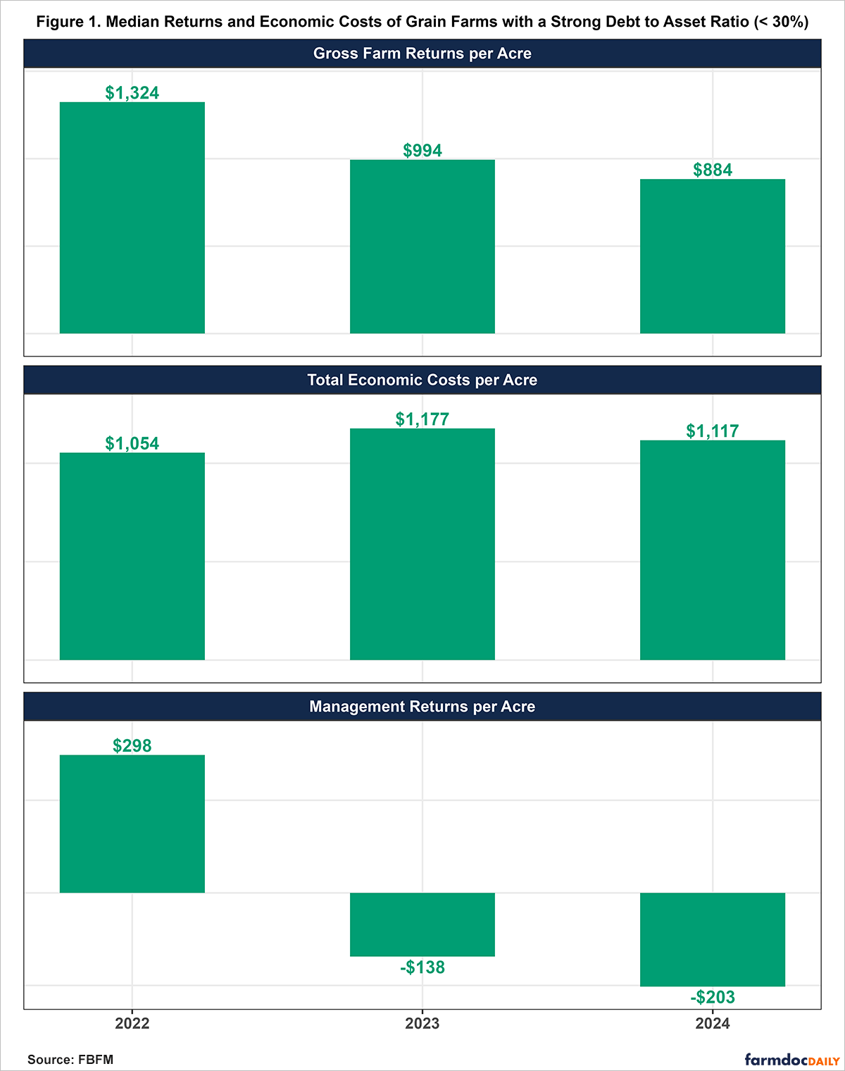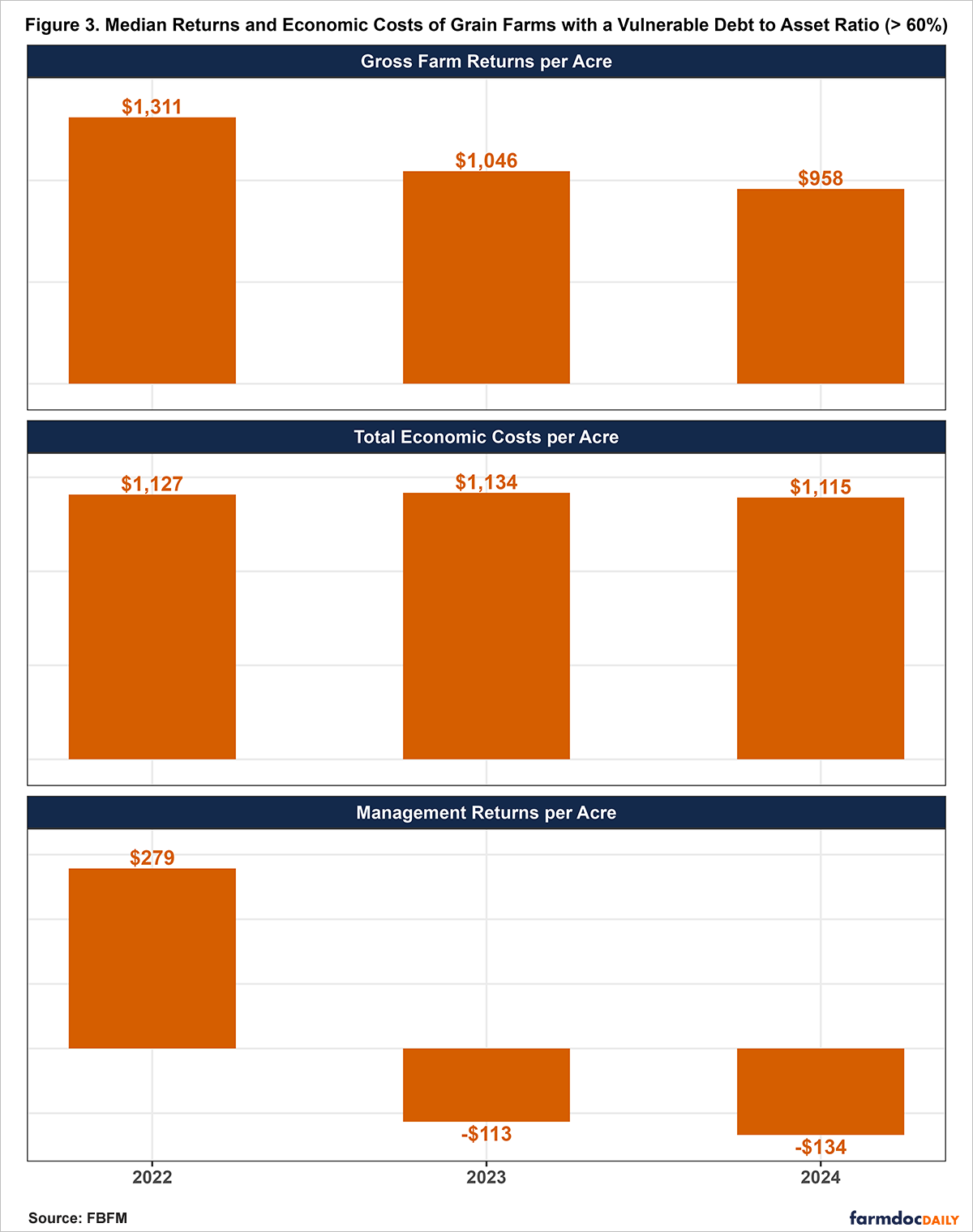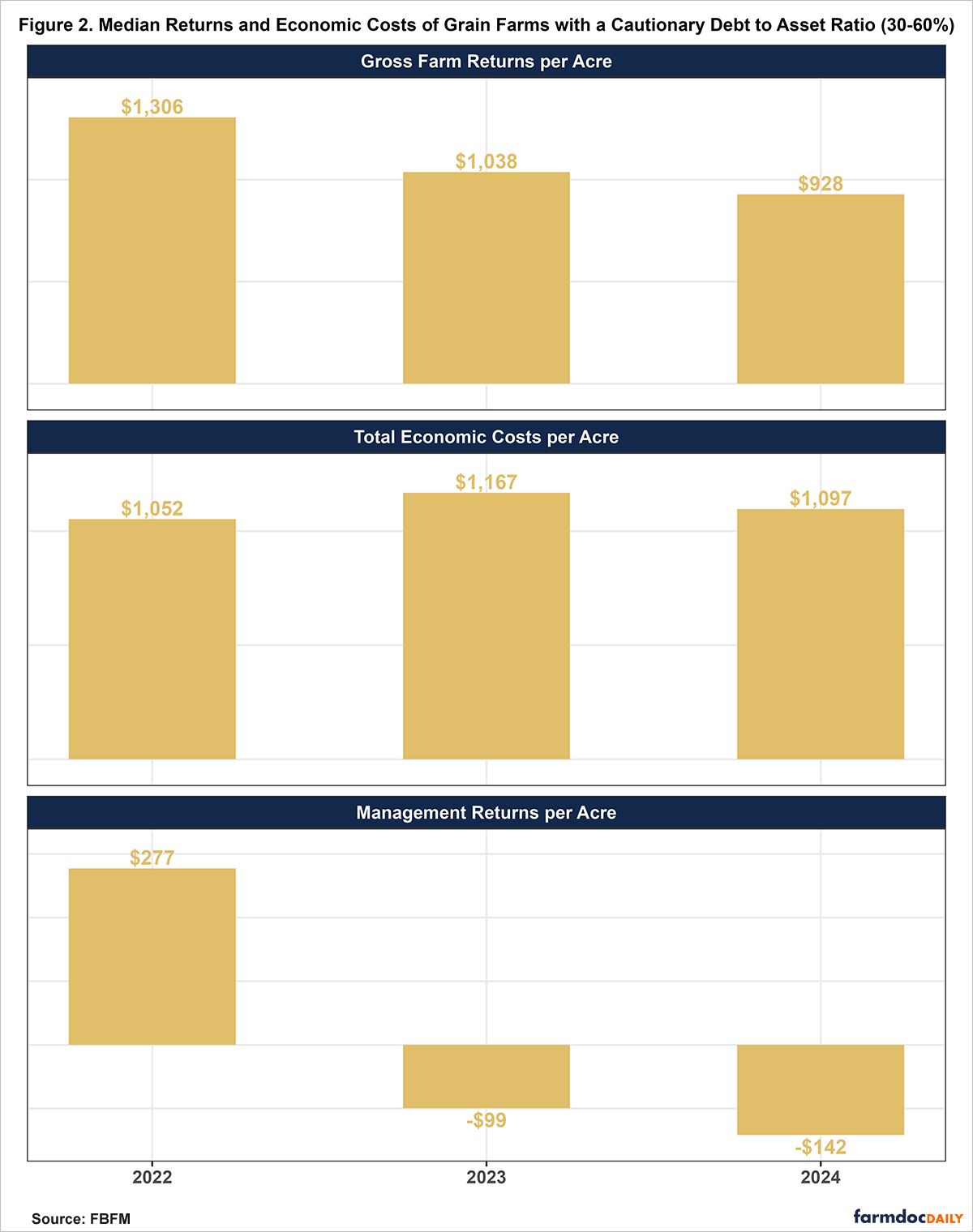 Grain farms in the cautionary category, with a debt-to-asset ratio between 30% and 60%, represented approximately 25% of all grain farms in each year. Figure 2 shows that median gross farm returns declined from $1,306 per acre in 2022 to $928 per acre in 2024, ending higher than those of strong farms in 2024. Meanwhile, total economic costs increased from $1,052 per acre in 2022 to $1,097 per acre in 2024. As a result, median management returns fell from $277 per acre in 2022 to –$142 per acre in 2024, though this decline was less severe than what was observed for strong grain farms.