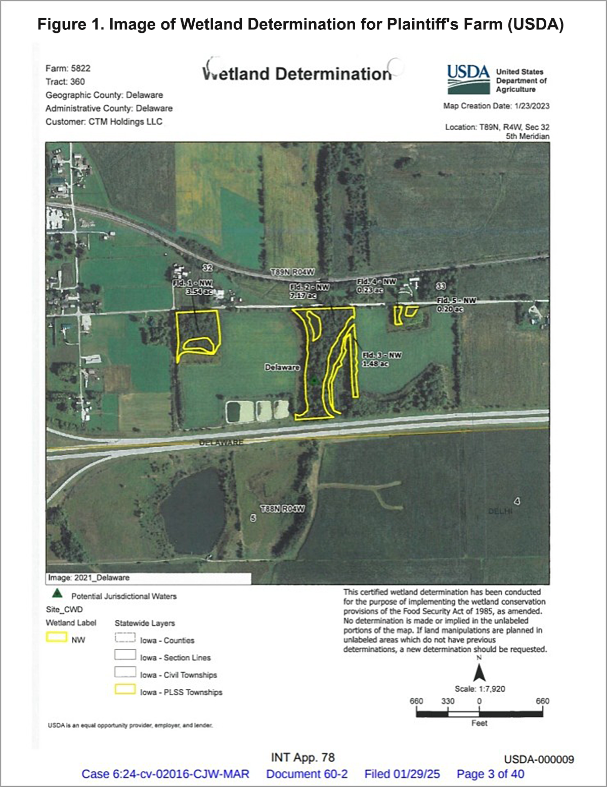 The lawsuit involves the nine acres within the 21.62 acres of forest that were determined to be wetlands by USDA. Figure 1 is the map of the farm included in the wetlands determination dated January 23, 2023. That determination was the result of a request by CTM. The initial wetlands determination was dated April 16, 2010, with another map and determination dated March 18, 2009. Communications between plaintiff and USDA prior to purchase of the land indicate that the plaintiff was aware of the wetlands determination prior to purchase of the property.