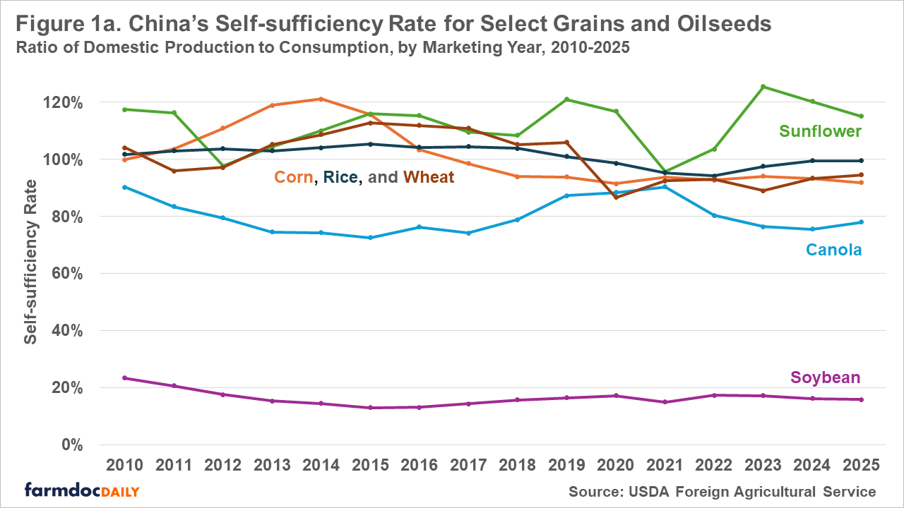 The self-sufficiency rate, or the ratio of domestic production to domestic consumption, describes the degree to which imports and existing inventories are necessary to fulfill commodity demand. Persistent imbalances reflect import dependence. In figure 1a, we describe China’s self-sufficiency since 2010 for select grains and oilseeds according to USDA Foreign Agricultural Service data. It shows China is close to self-sufficient in staple grains such as corn, rice, and wheat. Self-sufficiency in oilseeds is lower and more variable. China is basically self-sufficient in sunflower seed and has a canola self-sufficiency rate around 80%. For both staple grains and some oilseed crops, imports may be required in some years, and those imports may be significant relative to global trade, but China’s production and consumption are of similar magnitude.