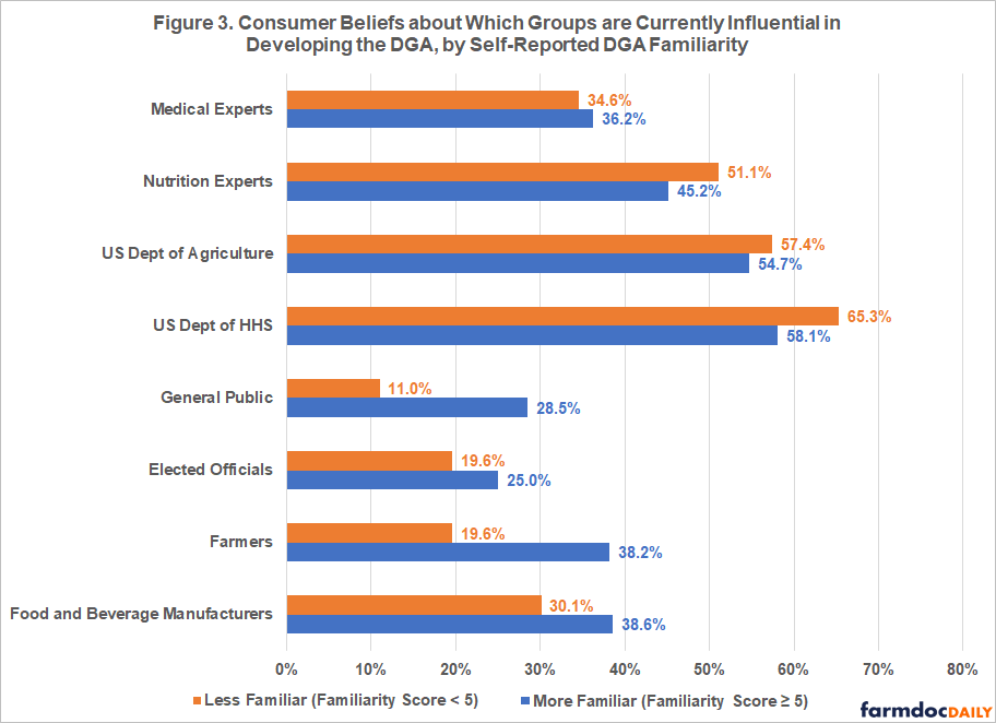 We also examined which groups consumers believe are currently influential in developing the DGA based on self-reported familiarity with the DGA. Figure 3 shows the respondents across those who reported they are more familiar with DGA (score of 5 or greater) with blue bars and those who were less familiar (score less than 5) in orange bars. We find that both groups viewed HHS, USDA, and nutrition experts as playing big roles in the DGA development. However, respondents who considered themselves to be more familiar with the DGA viewed its development as a much more inclusive process, with a larger share of respondents seeing a role for farmers, food and beverage manufacturers, elected officials, and the general public relative to respondents who indicated they are less familiar with the DGA.