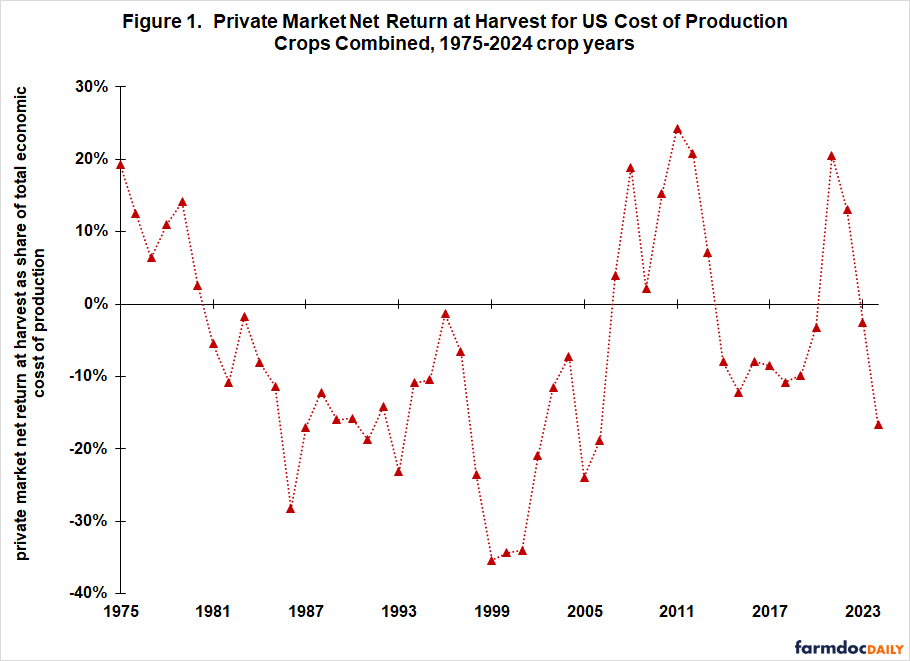 Figure 1 presents the yearly time path of aggregate private market returns at harvest since 1975 for the nine cost of production (COP) crops as a group. These crops are barley, corn, cotton, oats, peanuts, rice, sorghum, soybeans, and wheat. For a discussion of the data and methods used to construct Figure 1, see the farmdoc daily of April 11, 2025, especially the data notes.