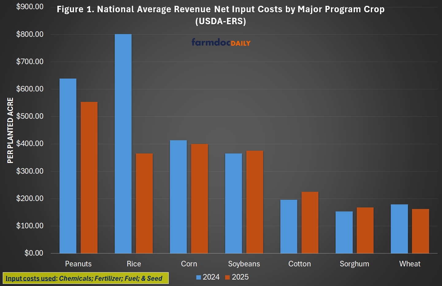 The first step is to compare crop returns for the major program crops (corn, soybeans, wheat, seed cotton, sorghum, rice, and peanuts) using the same category of costs. Figure 1 illustrates each crop’s national average revenue net (or minus) the input costs for the crop, also at national average levels. The input costs used for each crop are chemicals, fertilizer, fuel, and seed. The data is reported by USDA’s Economic Research Service and is for the 2024 crop year and the forecast for 2025 (USDA-ERS, Commodity Costs and Returns).