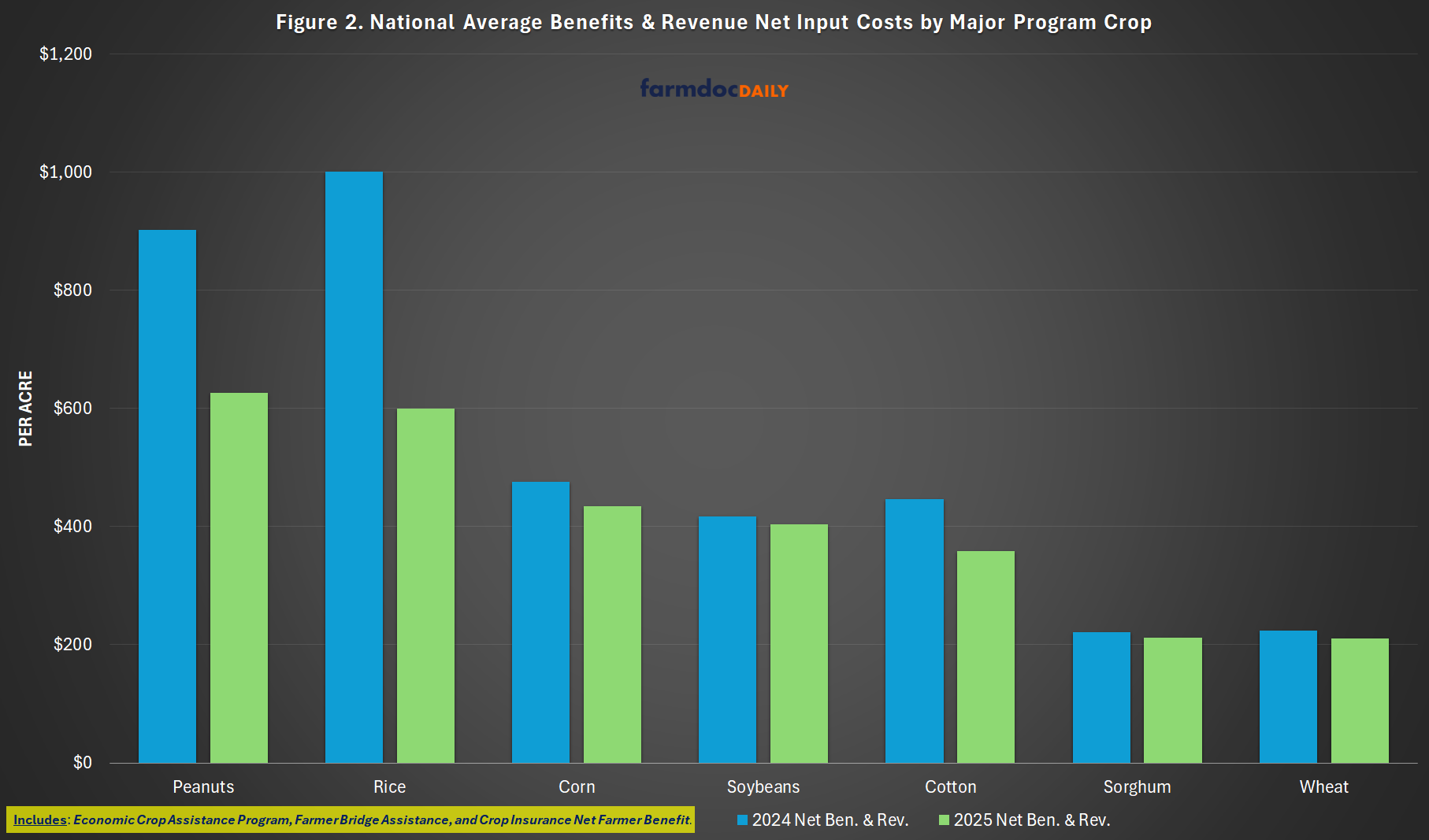 The calculations in Figures 1 and 2 are on the acres planted (including the acres insured), but ARC and PLC make payments on base acres rather than planted acres. Figure 3 illustrates those national average per base acre payments for the major programs for 2024 (paid in October 2025) and projected for 2025 (paid in October 2026) (farmdoc daily, November 11, 2025; November 18, 2025).