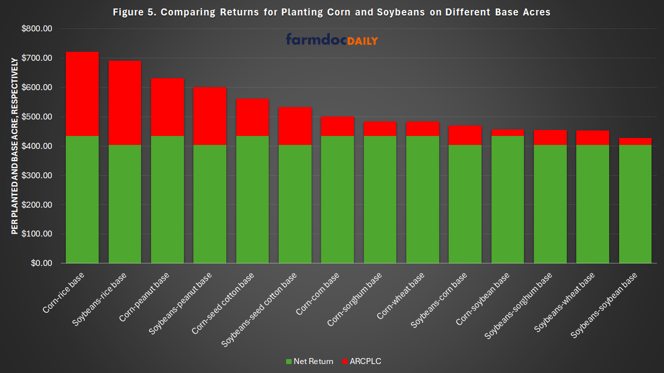 With base acres, a farmer can plant a different crop on the base acres. Doing so combines the ARC/PLC payment for the base acre crop (Figure 3) with the benefits and revenue of the planted crop (Figure 2). It presents a question about the best combination that produces the highest net return with the highest payment on the base acre. Figure 4 illustrates all combinations of planting and base acres for these crops, ranked from highest to lowest; because ARC/PLC payments were low for 2024, the comparison is for 2025 only.