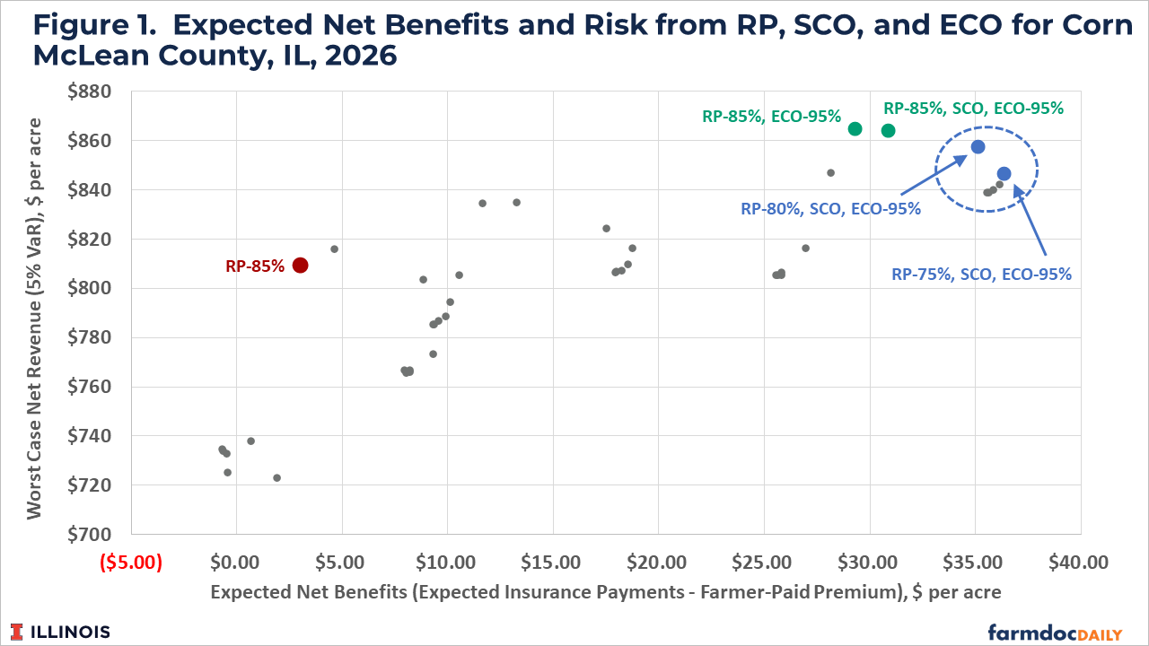 Significantly reduced farmer-paid premiums for Supplemental and Enhanced Coverage Option (SCO and ECO) policies suggest that farmers should consider using these products in their 2026 crop insurance portfolios. Adding SCO and ECO to higher coverage level farm-level plans such as Revenue Protection (RP) will increase expect returns and reduce risk, while also increasing total premium costs. Expected returns can be increased more by reducing RP’s coverage level while still using ECO and SCO. Those results are illustrated using farmdoc’s Crop Insurance Payment Evaluator.