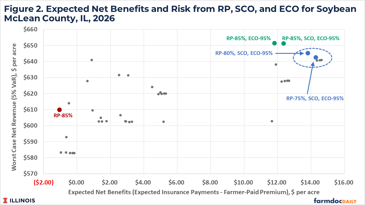 These observations suggest that all farmers should seriously consider using SCO and ECO as part of their federal crop insurance coverage portfolios in 2026. Risk reduction benefits will be maximized with high RP coverage (i.e. 85%) combined with SCO and 95% ECO but premium costs will increase accordingly. Premium costs can be reduced by using a lower coverage level for RP in combination with SCO and ECO. Trading higher farm-level coverage for area-based coverage with the supplemental policies could cause concern with matching coverage to farm-level losses and may not be warranted in all situations (see farmdoc daily from February 10, 2026). Still, the analysis suggests risk benefits can be improved, net benefits can be increased, and total premium cost will be similar compared with carrying RP at an 85% coverage level alone.