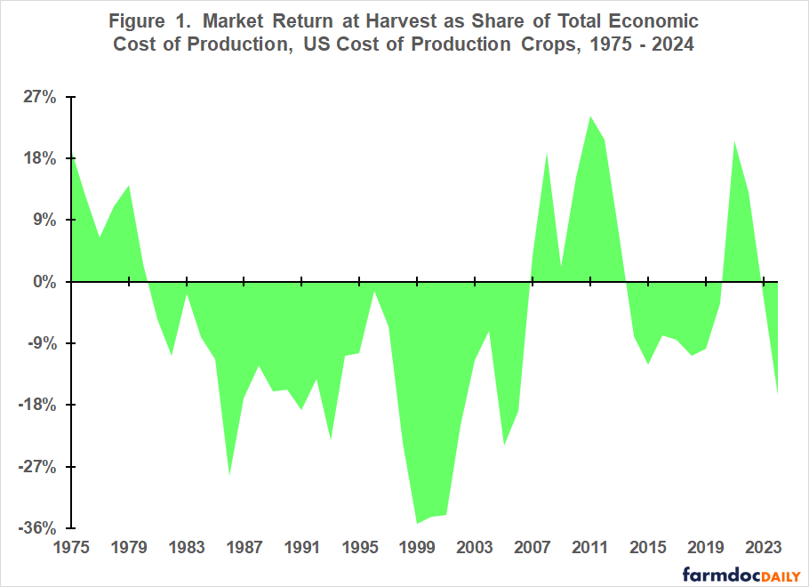 For each crop year from 1975 through 2023, net return and economic cost per planted acre for a crop and year are multiplied by acres planted to the crop in that year to generate total US net return and total US economic cost for the crop in the year. Total net return and economic cost for the COP crops for a year are summed to calculate an aggregate net return and economic cost for the nine crops as a group for the year. Planted acres are from USDA, NASS QuickStats.