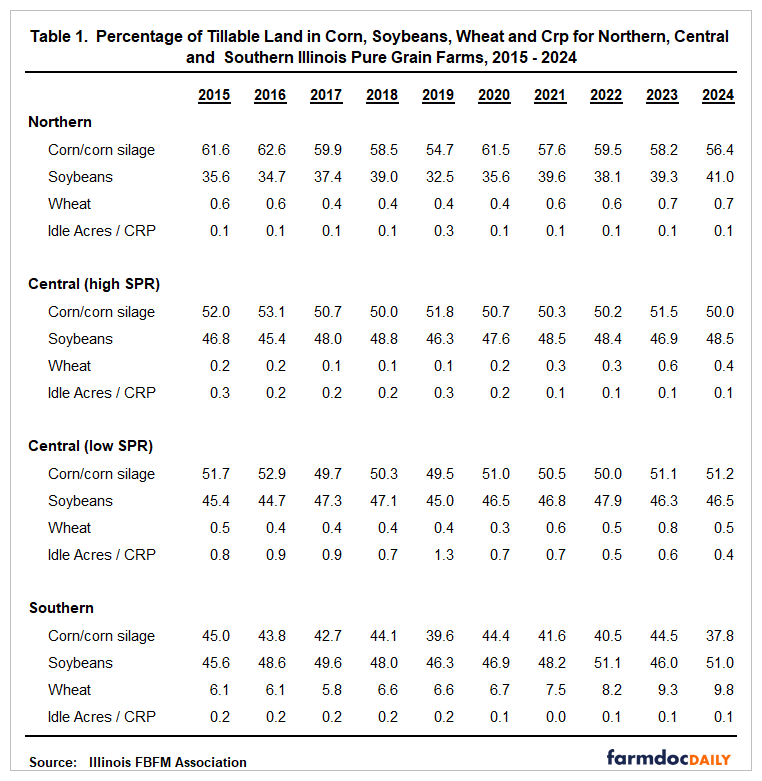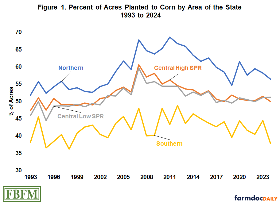 This article examines historic cropping patterns for northern, central and southern Illinois pure grain farms from 2015 through 2024 (Table 1) and the percentage of acres planted to corn by region from 1993 to 2024 (Figure 1). Farms in the study are enrolled in the Illinois Farm Business Farm Management (FBFM) Association. Farms in northern Illinois are generally located north of Interstate 80. Farms in southern Illinois are generally located south of Interstate 70. Central Illinois farms are located between the two Interstates. Farms in central Illinois are further divided between higher and lower soil productivity (SPR) levels. Financial, agronomic, weather, economic factors and the relative price of corn and soybeans will be taken into consideration by producers when adjustments are made in their cropping rotations.
