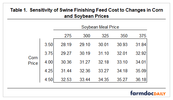 Feed costs are sensitive to changes in corn and soybean meal prices. Regression analysis was used to examine the relationship between swine finishing feed cost, and corn and soybean meal prices during the January 2007 to December 2025 period. Results are as follows: each 0.10 per bushel increase in corn prices increases feed cost per cwt. by $0.43, and each $10 per ton increase in soybean meal prices increases feed cost per cwt. by $0.37.