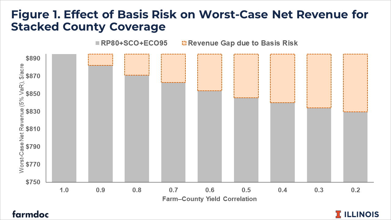 Substantially increased subsidies for Supplemental Coverage Option (SCO) and the Enhanced Coverage Option (ECO) as well as the independence from Title I program choices have led farmers to evaluate adding area-based coverage to their 2026 crop insurance portfolios (see farmdoc daily, February 3, 2026). As documented in earlier articles, reducing the coverage level election on Revenue Protection (RP) and stacking SCO and/or ECO over the RP policy may present both expected return and risk benefits compared to traditional high RP coverage alone (see farmdoc daily, February 17, 2026). Shifting some underlying farm-level coverage to county-based coverage, however, comes with what is known as a basis risk or the impact of imperfect correlation between the farm-level and county-level outcomes. In this article, the concept of basis risk is evaluated in terms of the impact of a farm’s risk exposure when a portion of the individual coverage RP policy is replaced with area-based coverage.