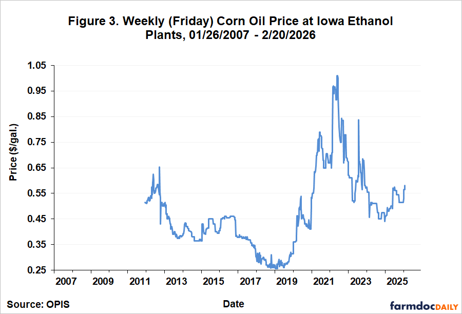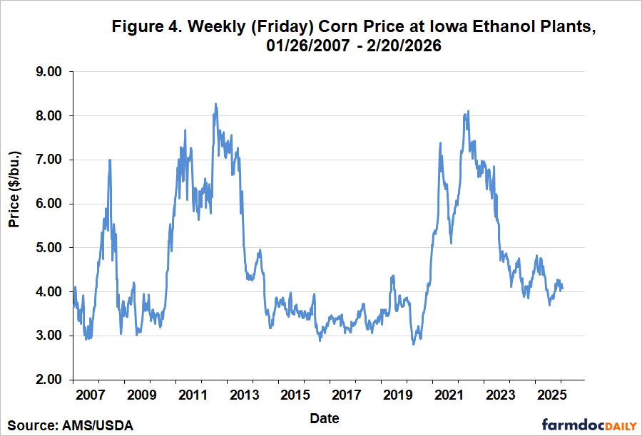Figures 1, 2, and 3 present the three main components of ethanol production revenue on a weekly basis from January 26, 2007 through February 20, 2026.  Figure 1 shows the weekly price of ethanol at Iowa plants.  The figure reveals that prices in 2025 traded most of the year in a relatively narrow range between about $1.50 and $1.70 per gallon.  The peak ethanol price of $1.83 occurred in October.  Figure 2 shows that weekly DDGS prices also moved in a narrow range in 2025 between roughly $125 and $150 per ton.  Figure 3 shows that weekly corn oil prices during 2025 started the year at $0.44 per pound, rose sharply to a peak of $0.56 in August, and then fell back to $0.52 by the end of the year.  Overall, the pattern of output prices for ethanol producers in 2025 can best be described as “rangebound.”