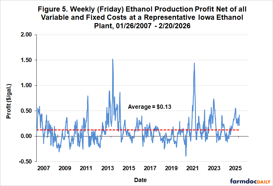 Recommended citation format: Irwin, S. "Ethanol Production Profits in 2025." farmdoc daily (16):36, Department of Agricultural and Consumer Economics, University of Illinois at Urbana-Champaign, March 4, 2026. Permalink