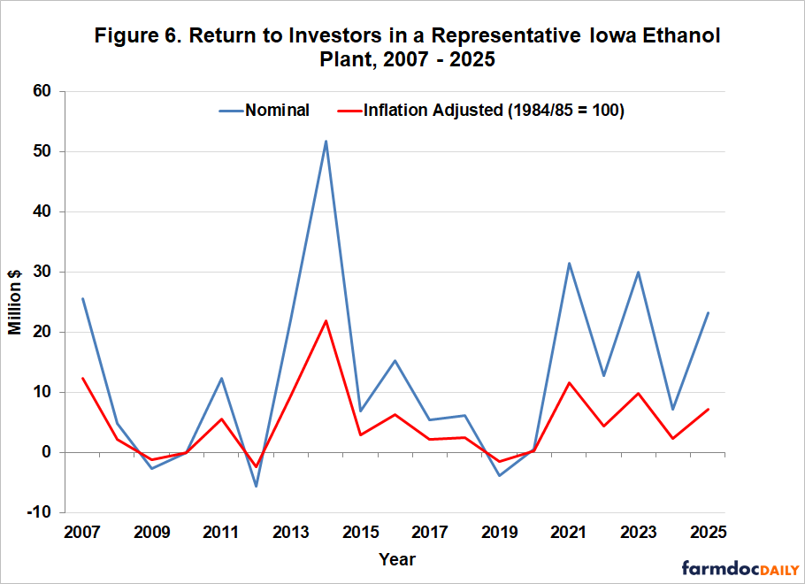 Dual-line chart showing annual nominal and inflation-adjusted returns to investors in a representative Iowa ethanol plant from 2007 to 2025, measured in millions of dollars. The inflation adjustment uses a 1984/85 base of 100. Nominal returns (blue) peak near $51 million in 2013 and $31 million in 2021, while inflation-adjusted returns (red) are consistently and substantially lower, peaking around $22 million in 2013. Both lines show losses around 2009, 2012, and 2019. Source: farmdoc DAILY.