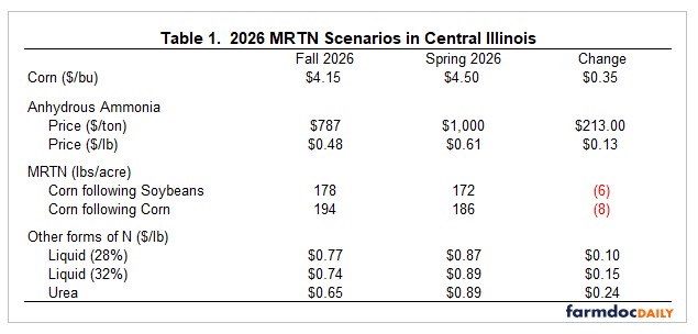 Table titled “2026 MRTN Scenarios in Central Illinois” comparing Fall 2026 and Spring 2026 values with the change between them.Corn price is $4.15 per bushel in fall and $4.50 in spring, an increase of $0.35. Anhydrous ammonia price rises from $787 per ton ($0.48 per lb) in fall to $1,000 per ton ($0.61 per lb) in spring, an increase of $213 per ton or $0.13 per lb. MRTN (maximum return to nitrogen) rates in pounds per acre decrease: corn following soybeans drops from 178 to 172 (down 6), and corn following corn drops from 194 to 186 (down 8). Other nitrogen forms also increase in price: liquid 28% rises from $0.77 to $0.87 per lb (up $0.10), liquid 32% from $0.74 to $0.89 (up $0.15), and urea from $0.65 to $0.89 (up $0.24).