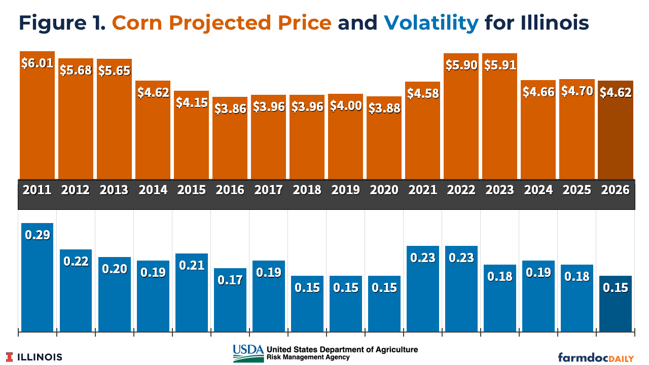 The 2026 Volatility Factor for corn is 0.15, down from a value of 0.18 in 2025 (see lower panel of Figure 1). The lower Volatility Factor will lead to lower insurance premiums for revenue products this year, holding other factors constant. The 0.15 Volatility Factor matches the lowest values observed in the past 15 years.