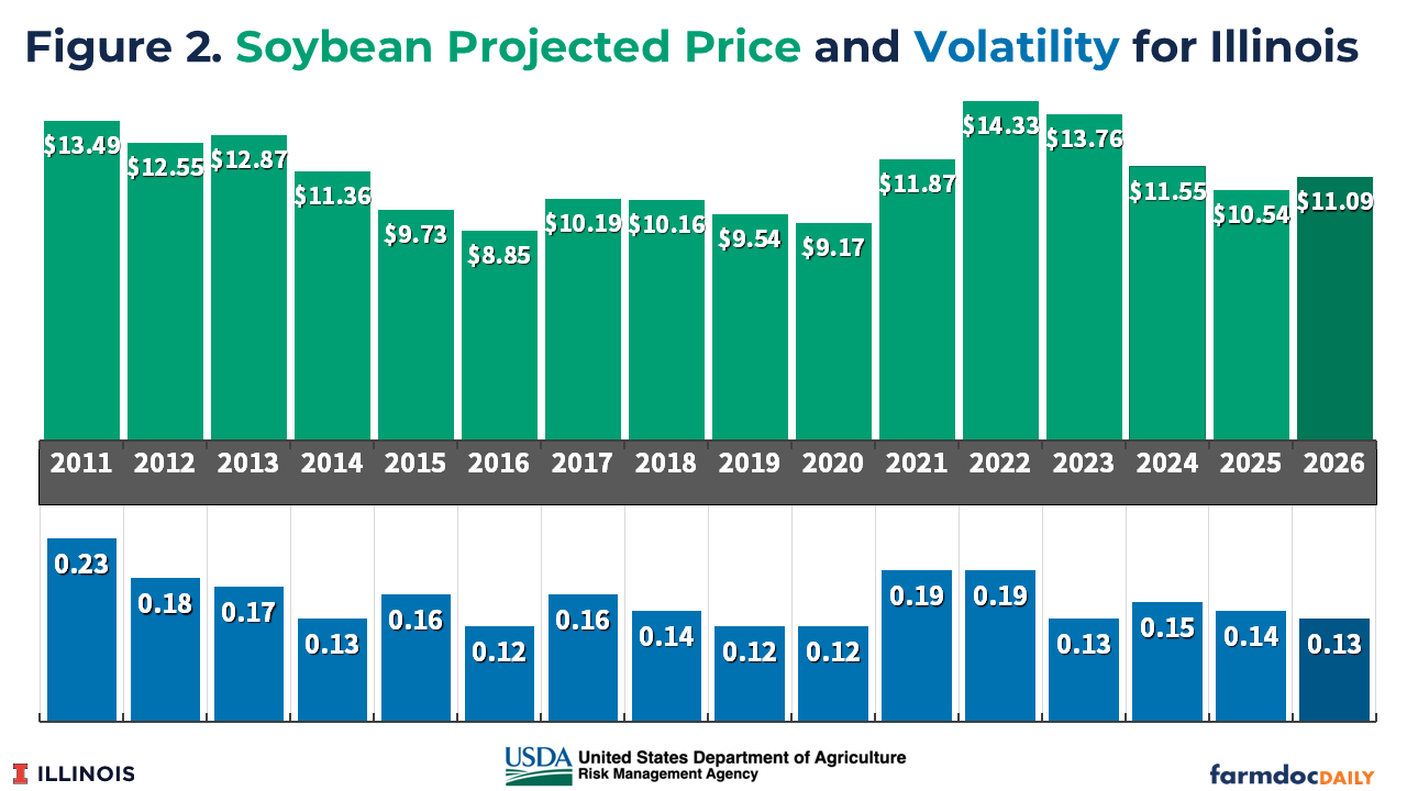 The 2026 Volatility Factor for soybeans is 0.13, down from 0.14 in 2025 (see lower panel of Figure 2). This is the lowest Volatility Factor for soybeans since the 2023 crop year and only slightly higher than the lowest value of 0.12 over the past 15 years. The lower Volatility Factor will tend to reduce premium costs for equivalent revenue policies compared with years with higher Volatility factors, assuming other premium pricing factors are the same.