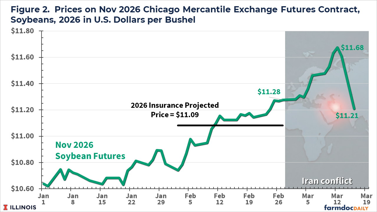 For soybeans, the November 2026 futures price on CME was $11.28 per bushel on February 27. From February 17, soybean futures prices have increased on most days, reaching $11.68 on March 12, an increase of $ 0.40. Then, prices fell to $11.61 on March 13 and $11.21 on March 16. The latter fall has been attributed to the prospect that President Trump will not meet with China’s Premier Xi Jinping, potentially leading to no or few additional U.S. soybean exports to China in 2026.