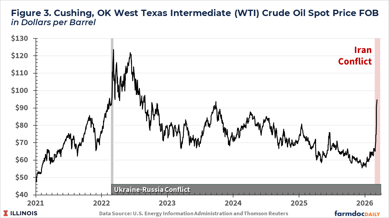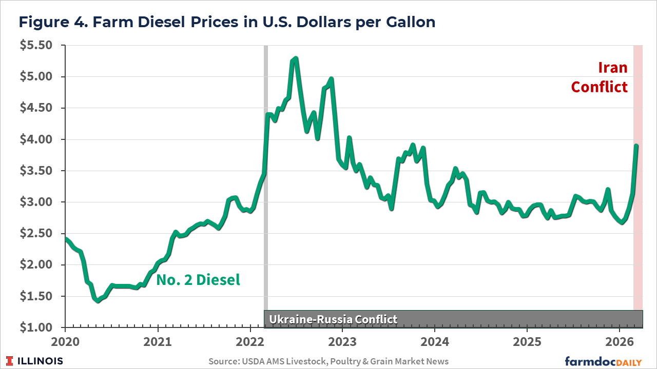 Those crude oil price increases are being transmitted to farmers. In its March 6th report on Illinois Production Costs, the Agricultural Marketing Service reported diesel fuel prices at $3.90 per gallon, up by $ 0.76 from the previous level of $3.14 per bushel (see Figure 4). If crude oil continues to rise, diesel fuel prices could be above $4.50 per gallon, similar to the last time crude oil prices exceeded $120 per barrel.