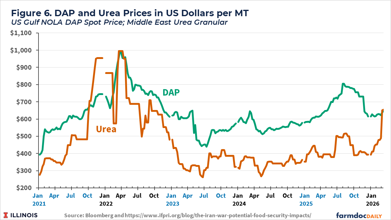 Wholesale nitrogen fertilizers increased after the February 28th bombing campaign began. Before February 27, wholesale urea prices at New Orleans were below $500 per ton. On March 13, prices were over $650 per ton (see Figure 6).