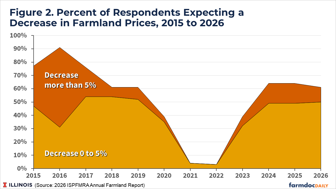 The ISPFMRA survey indicates a clear consensus that the rapid, double-digit appreciation of farmland values has paused. When asked about their expectations for 2026, 61 percent of respondents indicated they expect farmland prices to decline overall.