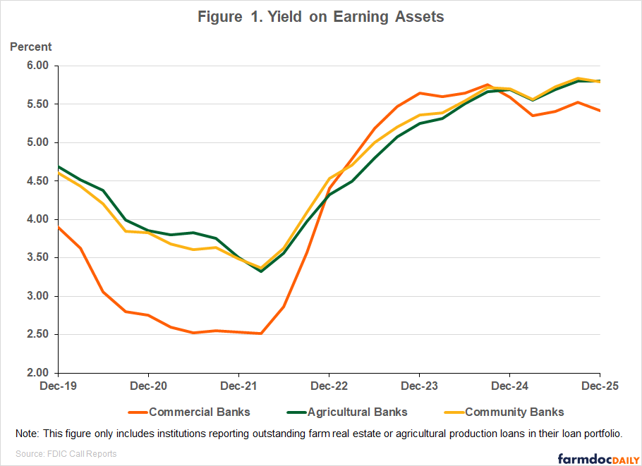 In the fourth quarter, the yield on earning assets for agricultural and community banks remained above that of the full sample of commercial banks with agricultural loans, as shown in Figure 1. Yield on earning assets (YEA) measures the total interest, dividend, and fee income earned on loans, securities, and other investments as a share of average earning assets (see 2025 Quarter 4, FDIC QBP). For the full sample, YEA was 5.41 percent in the fourth quarter, which was 11 basis points lower than the previous quarter, and 18 basis points lower compared to a year ago. By comparison, agricultural banks reported a YEA of 5.80 percent, which was unchanged from the previous quarter, and 11 basis points higher than in the same period last year. Community banks also reported a YEA of 5.80 percent, which was 4 basis points lower than in the prior quarter, but 10 basis points higher than a year ago.