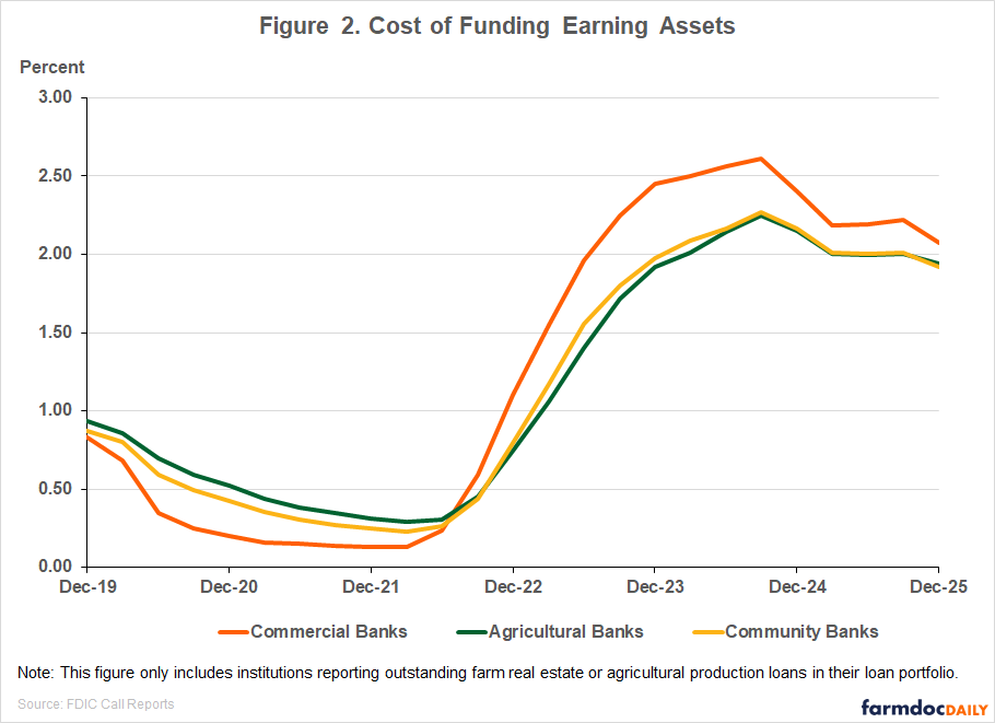 Cost of funding earning assets (CFEA) measures the interest expense paid on deposits and other borrowed funds as a share of average earning assets (see 2025 Quarter 4, FDIC QBP). While yields on earning assets remained above the full-sample average for both subsamples, funding costs stayed below the full-sample average in the fourth quarter, as shown in Figure 2. For all commercial banks that make agricultural loans, the CFEA was 2.07 percent, 15 basis points lower than in the prior quarter and 33 basis points lower compared to a year ago. On the other hand, agricultural banks reported a CFEA of 1.94 percent, while community banks reported 1.92 percent in the fourth quarter. Compared to a year ago, this translates to funding costs declining by 21 basis points for agricultural banks and by 24 basis points for community banks.
