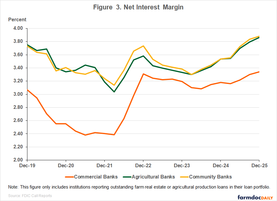 Recommended citation format: Mashange, G. "Net Interest Margins of U.S. Commercial Banks Participating in Agricultural Lending Widen in the Fourth Quarter of 2025." farmdoc daily (16):56, Department of Agricultural and Consumer Economics, University of Illinois at Urbana-Champaign, April 2, 2026. Permalink