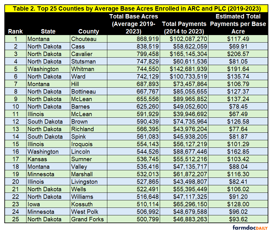 Table 2 presents the top 25 counties by total base acres enrolled in ARC and PLC, averaged for the years 2019 to 2023. Again, these years are used in part because of the addition of seed cotton in 2018. The table includes an average payments per base acre as in Table 1.