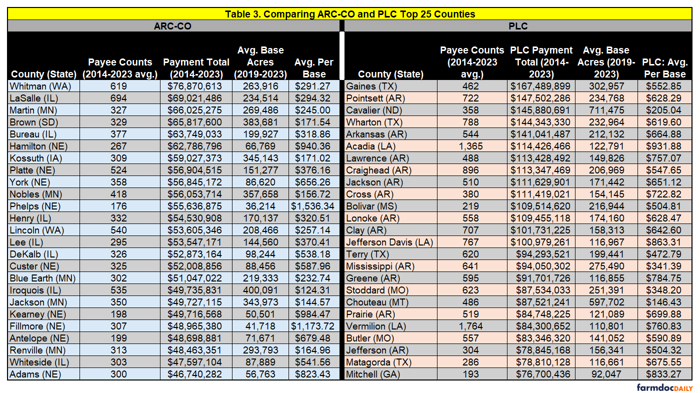 Regional dynamics dominate, direct and define payments to farmers. Southern counties make up 18 out of the top 25 counties (72%) and have much higher average payments per base acre. The importance of these differences is the fact that a farmer can plant other crops on the base acres (especially corn and soybeans), adding the payments from the programs to the revenue of the crop planted. When that happens, farmers producing and marketing the same crops can receive very different incomes because of the choices in federal payment policy design (farmdoc daily, January 29, 2026; February 12, 2026).