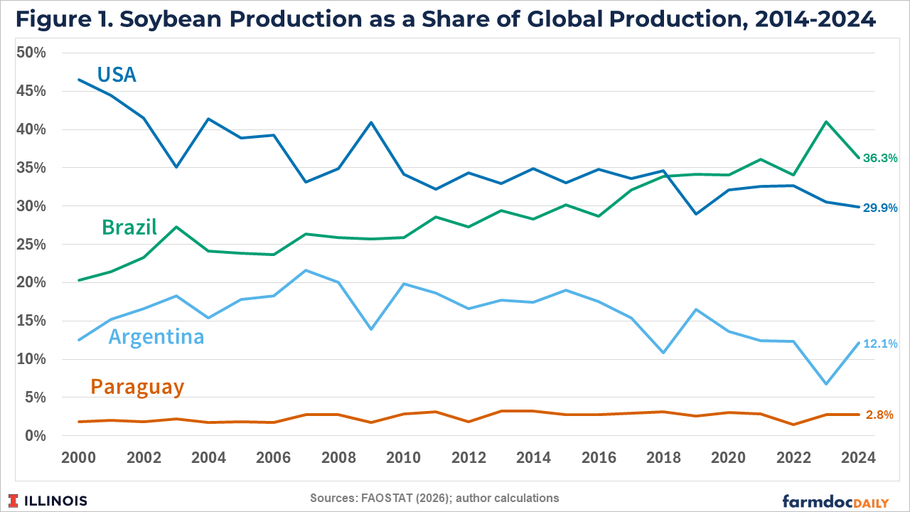 Compared with Brazil, the US, and Argentina, Paraguay accounts for a relatively small share of global soybean production: just under 3% (see Figure 1). Brazil’s production share has trended up, reaching over 35% in recent years while the US share has trended down to around 30%. Argentina’s production share has also declined but has generally remained between 10 and 15% of global production.