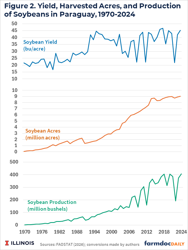 Since 1970, soybean production in Paraguay has increased, surpassing 400 million bushels multiple times in recent years (see upper panel of Figure 2). Increases in production have been achieved through increased productivity and acreage expansion.