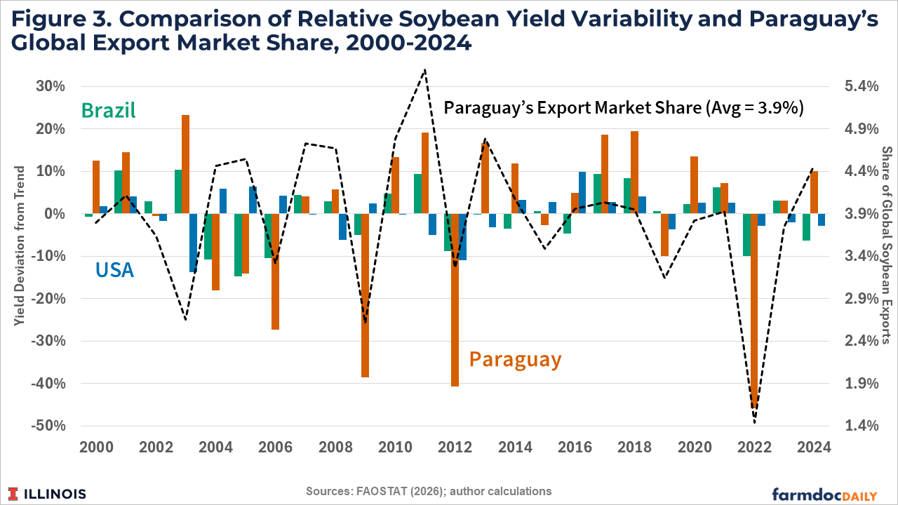 Limited opportunities for further acreage expansion suggest Paraguay will remain a relatively small producer with future production increases needing to be driven by continued yield growth. However, soybean production in Paraguay has been associated with high yield variability, resulting in large fluctuations in annual production. This variability, in combination with its dependence on exports means Paraguay can have a noticeable impact on the global soybean market.