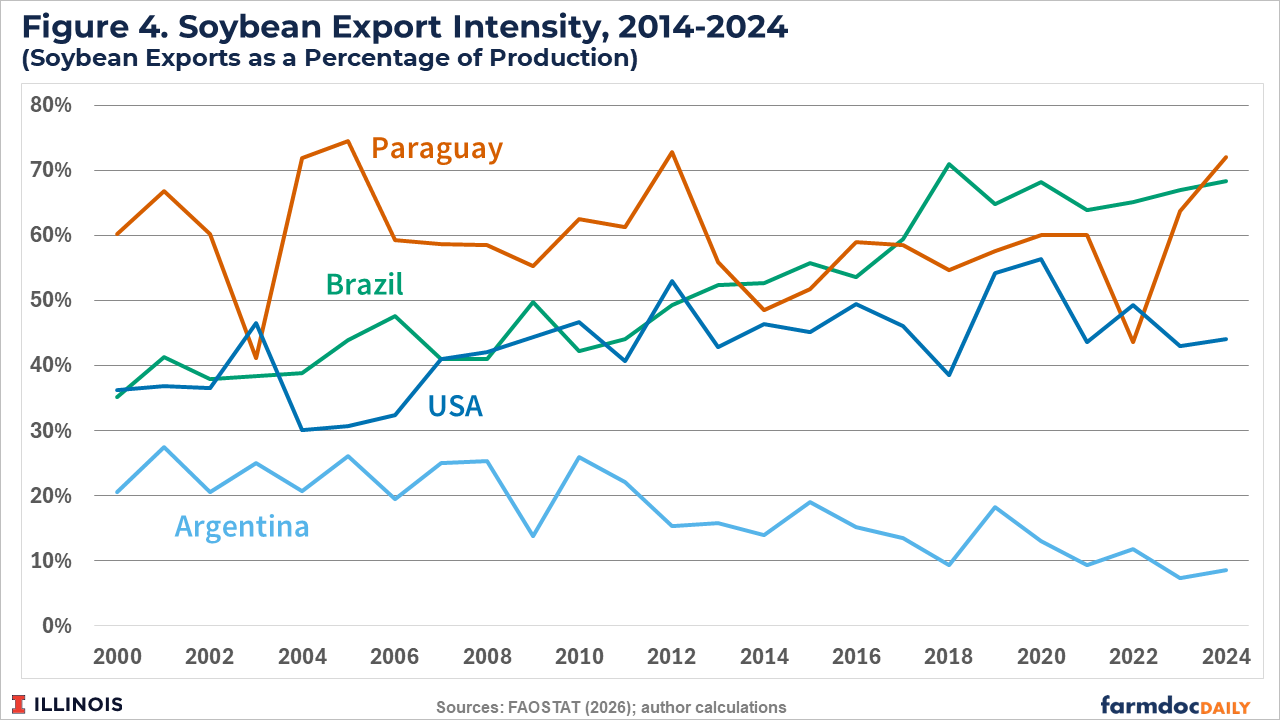 Paraguay is heavily reliant on export demand, with an average export to production ratio of around 60% (see Figure 4). Brazil’s export ratio has been 65% in recent years while the US export ratio is generally between 40% and 50%.