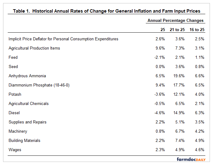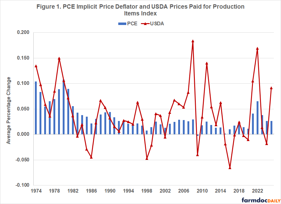 Using information for the 1973 to 2025 period from the Federal Reserve Bank of St. Louis on inflation rates and farm input price indices from USDA-NASS, we examined the correlation between the implicit price deflator for personal consumption expenditures and agricultural production items (i.e., aggregate input price index for production agriculture), feed, seed, fertilizer, fuels, labor, and machinery. The correlation coefficient between the implicit price deflator and agricultural production items was 0.59. The average annual rate of change for agricultural input prices over the period was higher (4.1 percent) than the rate of change for the implicit price deflator (3.4 percent). The average annual price changes for labor (4.5 percent) and machinery (5.5 percent) were significantly higher than the average increase in the implicit price deflator. In terms of the six specific input categories examined, the only correlation between the implicit price deflator and a specific input price change that was not significantly different from zero was the correlation between the implicit price deflator and feed prices. The correlations between the implicit price deflator, and labor and machinery were relatively higher than the correlation between the implicit price deflator and general farm price index (i.e., agricultural production items). This is an important result because it suggests that input prices for labor and machinery more closely follow trends in general inflation than input prices for items such as feed, seed, fertilizer, and fuels.