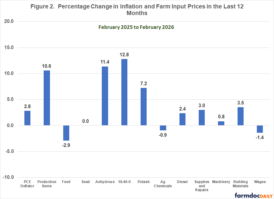 Figure 2 illustrates average input prices for the latest 12 months for which data were available (i.e., February 2025 to February 2026). Data for February 2026 for the implicit price deflator was not available, so data for rate of change for the January 2025 to January 2026 period were used for this variable. The percentage change in the implicit price deflator was 2.8 percent. This is down sharply from the annual average in 2021, 2022, and 2023 (i.e., 4.1 percent, 6.3 percent, and 3.7 percent, respectively), but was similar to the 10-year average. The aggregate input price index for all production items input price was 10.6% year to year. In addition to fertilizer, the large price increase for purchased feeder livestock contributed to the large year-to-year change in the aggregate input price index. There was a lot of variability in individual agricultural input prices. Nitrogen, phosphorus, potash, supplies and repairs, and building materials had higher input price changes than general inflation while the rest of inputs illustrated in Figure 2 had lower relative price changes. The results in Figure 2 can be used to help explain why the breakeven prices for corn and soybeans did not decline in the last year.
